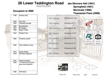 The Hampton Wick: Brick by Brick project traces the development of the roads and buildings of Hampton Wick from 1750 to the present day. The outputs of the research have been used to create three books alongside this dedicated website. Together they provide a complete catalogue and history of all 650 residential buildings in the village - who owned the land? who built the houses? who has lived in them? how have the buildings been altered and extended over time? what else do we know about each property?