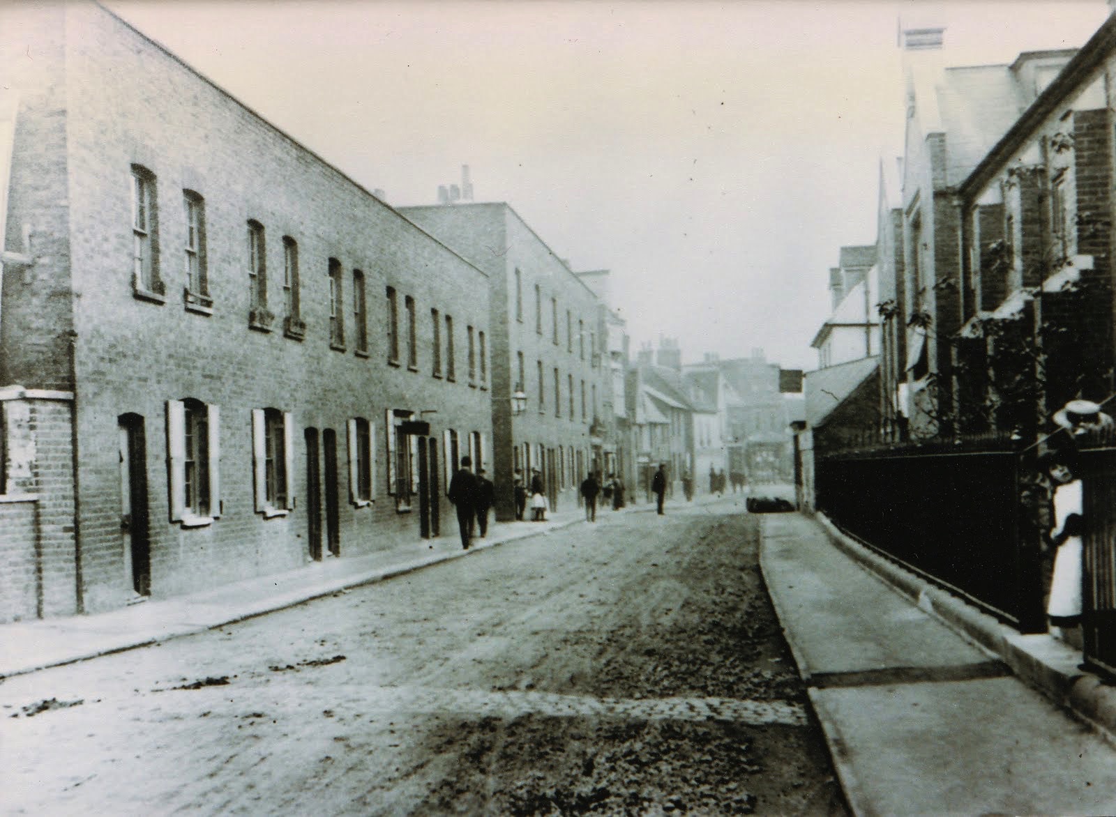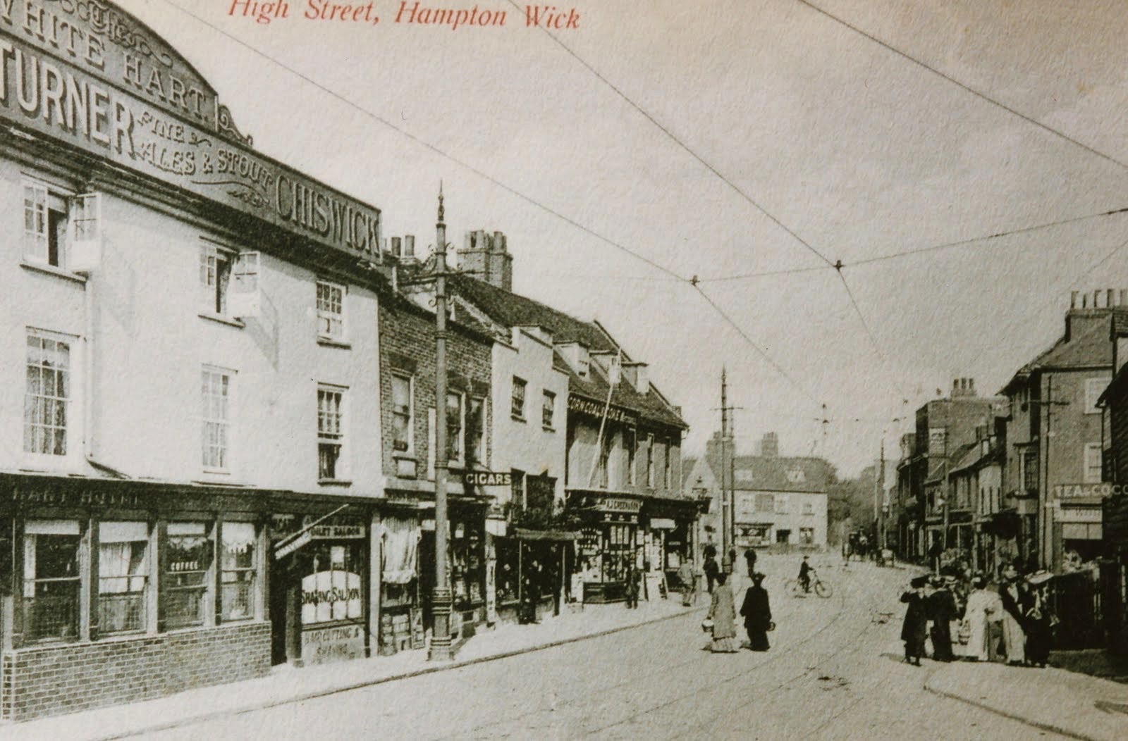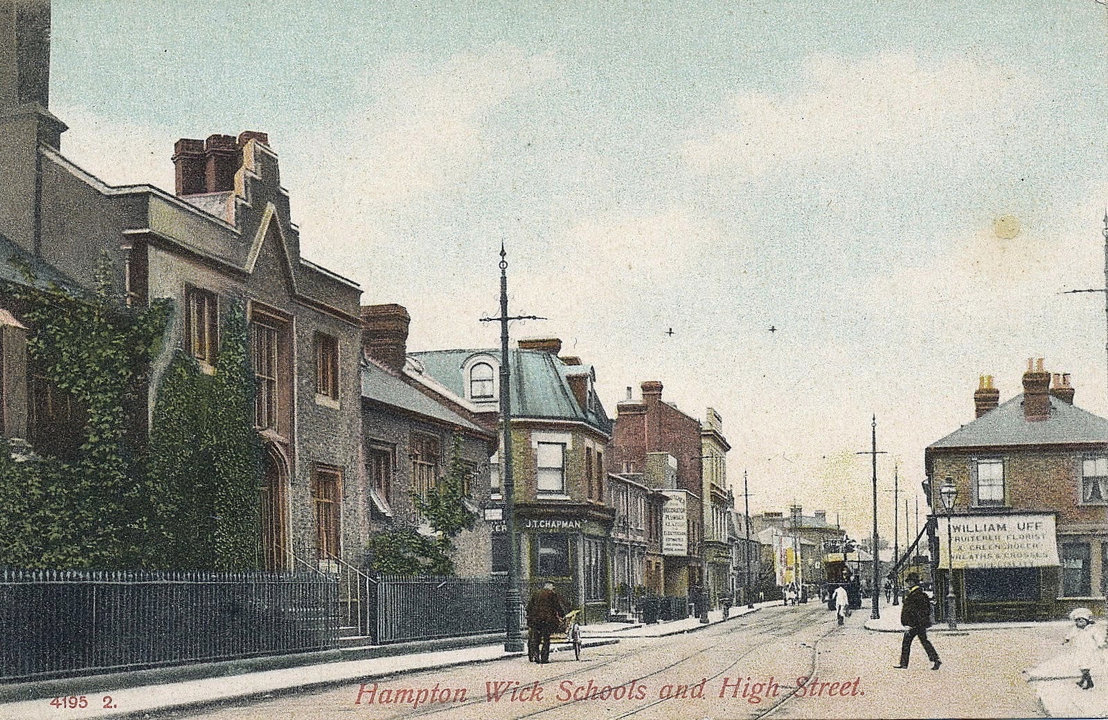 Looking north around 1900 to the beginning of the High Street from what is now the central reservation of the pedestrian crossing at the end of Hampton Court Way.