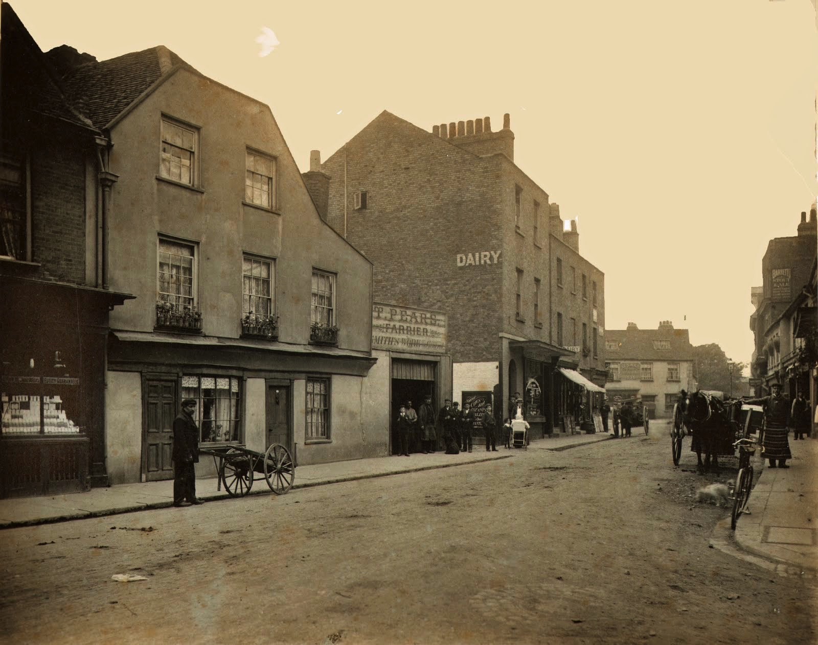 Looking SE down the High Street from opposite the present-day Lanson Running shop. The 1900 version of "The Swan" is on the left. All the buildings in the distance still exist and are remarkably unchanged, starting with Robert Belchamber's Post Office and Baker (now offices), CJ Winterbourne's Grocery (now the Deep Blue Fish Shop), Winterbourne's second premises which sold lamps and china goods (now offices) and George Webb's Poulterers.