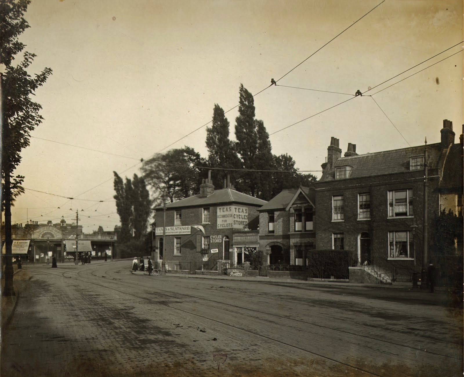 The camera is looking toward the Kingston Bridge approach from a vantage point opposite the "Old Kings Head" sometime in the period 1912 - 1917. On the right are The Gate House and Fern Glen. The two buildings immediately beyond have disappeared and are now the site of the Hampton Wick War Memorial and its gardens. In the distance on the far left of the picture is Hampton Court Parade of five shops.