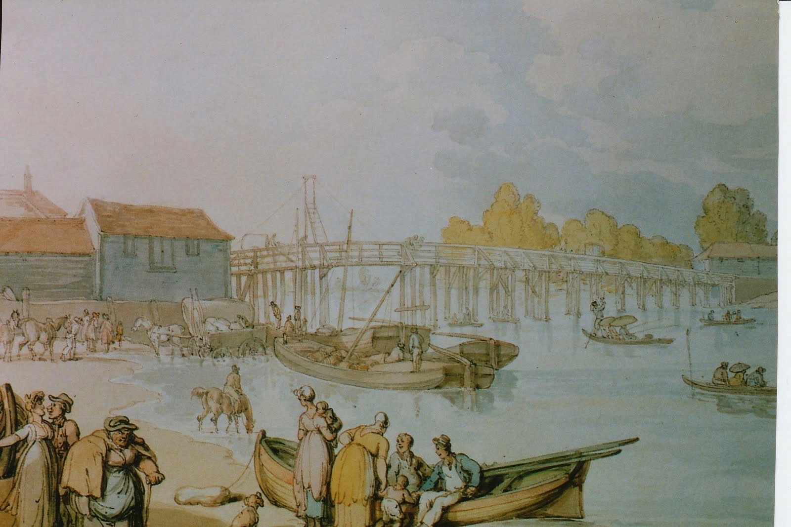 Throughout its history Hampton Wick’s importance was largely due to the ability to cross the river here, initially by a ford, from the thirteenth century by a wooden bridge and from 1828 by a stone bridge. For long, the bridge was the only bridge between London Bridge and Staines.