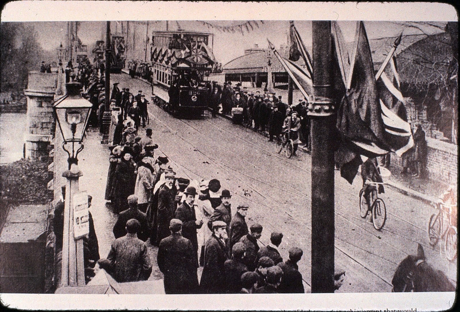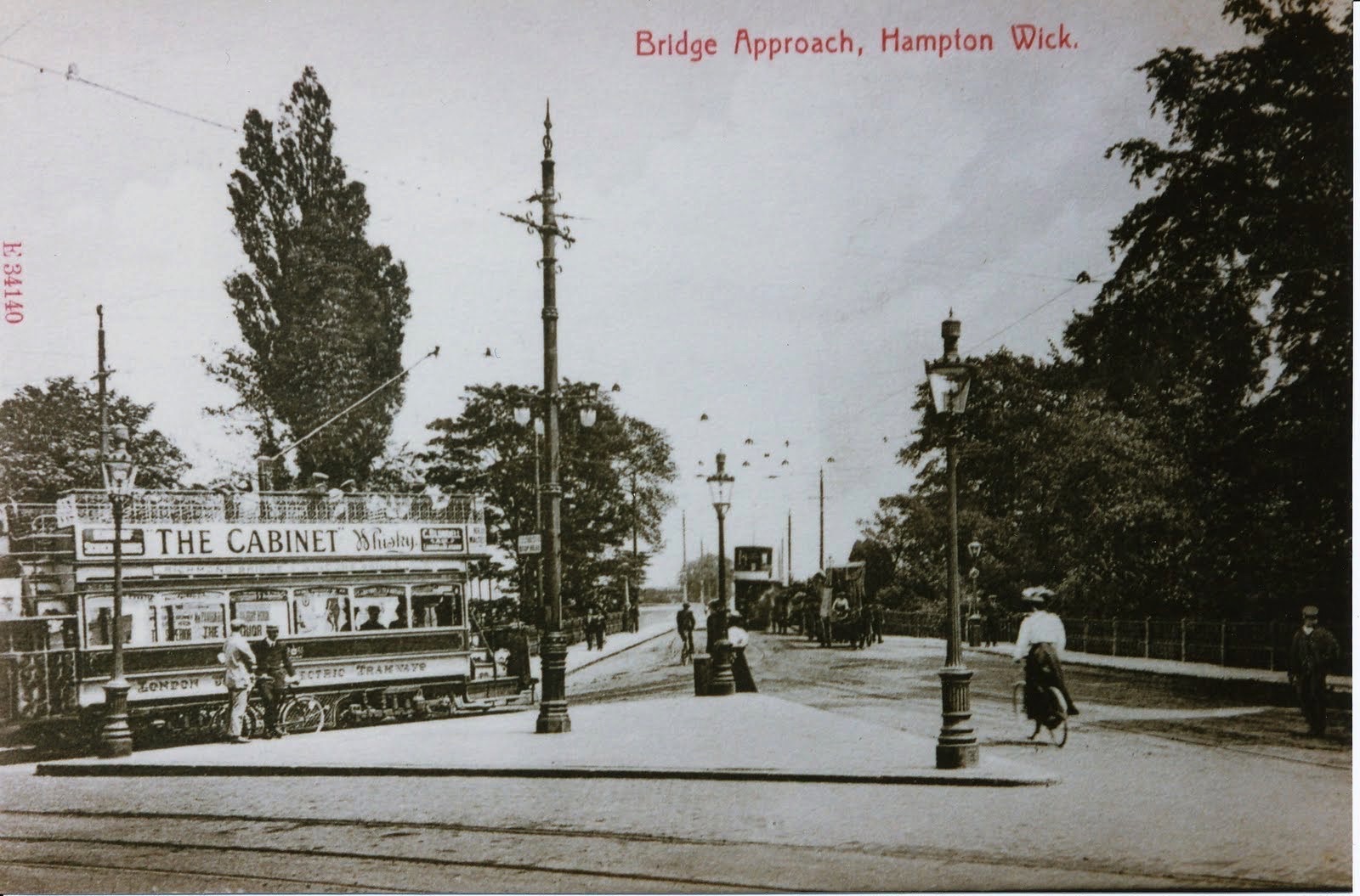 Trams arrived in Hampton Wick with routes running from Twickenham starting in 1903 and across Kingston Bridge in 1906. The need to alleviate sharp bends and widen the roads led to much demolition but also improved road surfaces with wood (and sometimes stone) blocks.